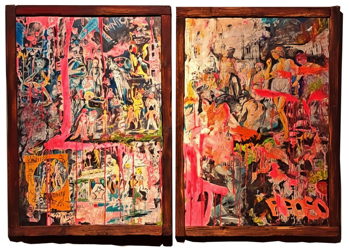 Egy diptichon, amelyben a reneszánsz és a popkultúra egymásra feszül, egymásra csúszik. Az információs zaj, a posztmodern fragmentáltság, a graffiti és a klasszikus pátosz feszültségében jelenik meg a kérdés: lehet-e ma még szent képet festeni?