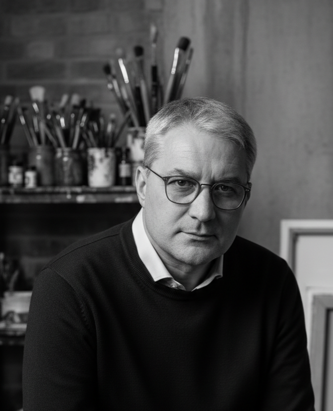 Dávid Ervin festő, képzőművész a Dávid Art Galéria rezidens alkotója, a Fine Arts Capital alkotói csoport alapító tagja. Munkáiban a festészet hagyományos eszközeit fotográfiai és digitális elemekkel ütközteti, rétegzett, töredezett képi világot hozva létre. Alkotásai az emlékezet, a hiány és a történelmi tapasztalat vizuális lenyomatait kutatják. A most kiállított sorozata a képeket nem esztétikai végpontként, hanem egy feltárás köztes állomásaiként kezeli: vizuális nyomokként, ahol az ikonikus idő, a jelen ideje és a periférikus idő egymásba csúszva válik olvashatóvá.