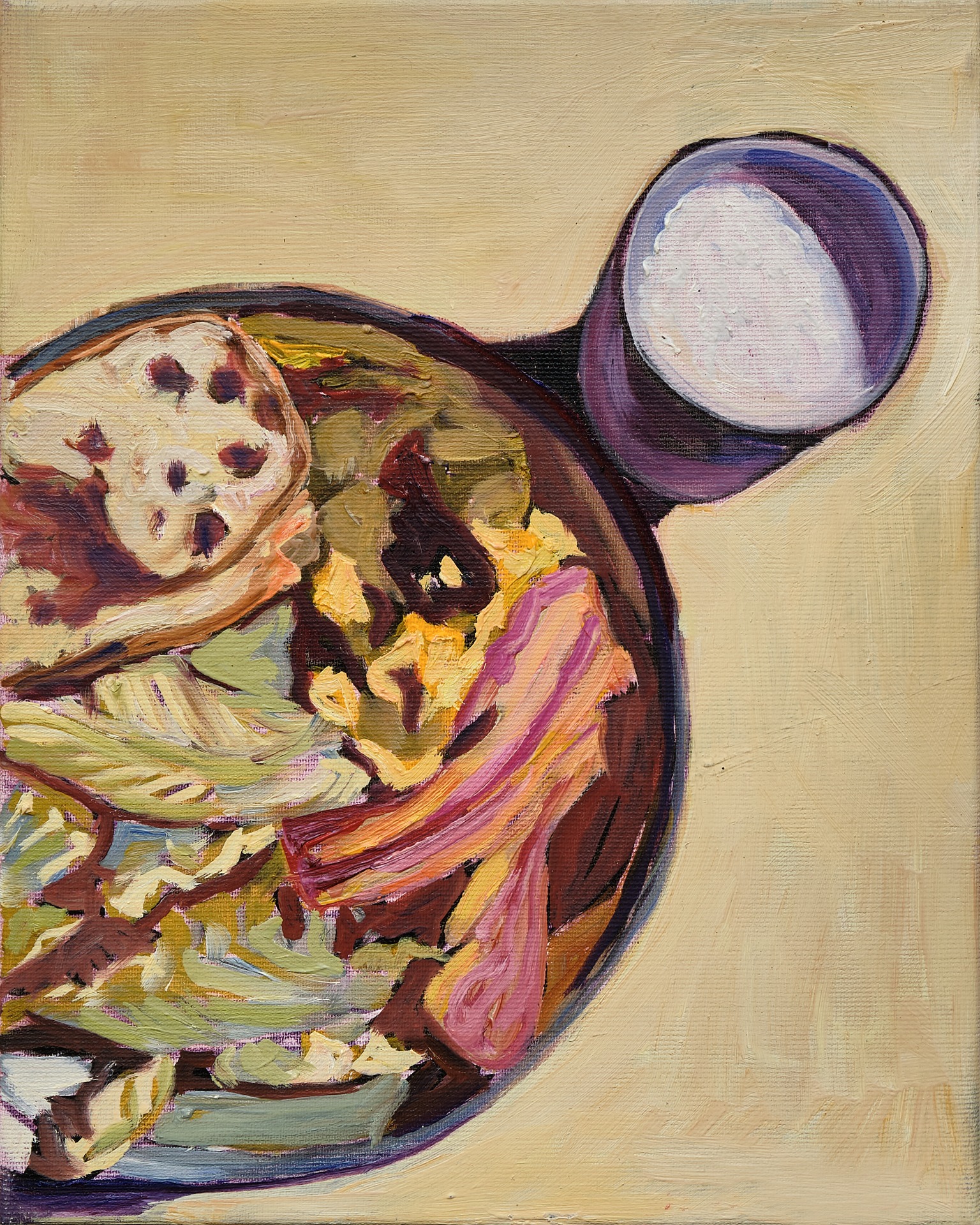 The centerpiece of my painting is a set dining table. At first glance, it appears to be a still life, but in fact, this everyday setting carries deep symbolic meaning. For me, the table is a meeting point: family stories, holidays and everyday life, presence and absence, closeness and distance all appear on it at once. In my paintings, the arranged objects, the empty or used plates, glasses, and textures are all imprints of human relationships.