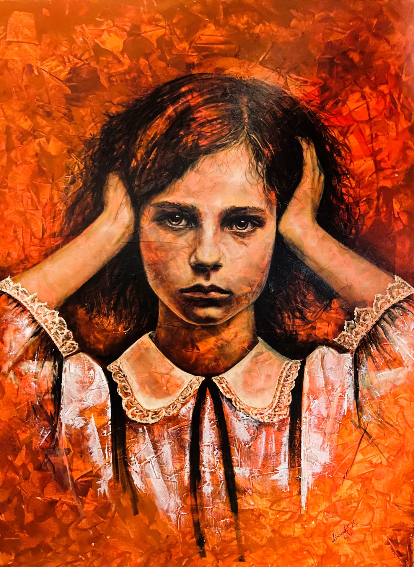 Lőrinc Krisztina - Ellopott gyermekkor című nagy ciklusának központi képe. A kislány a kezét a fülére szorítja, mintha éppen el akarná zárni magát attól a rettenetes hangzavartól, amelyet maga a "világ" bocsát ki. Tekintete üressé válik, arca szinte maszkszerű, - merev. A világ izzik, üvölt és forr körülötte. Elkerülhetetlen a szembenézés a megváltoztathatatlannal.