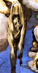 Szent Bertalan kezében tartott lenyúzott bőre – amelyet a művészettörténet gyakran Michelangelo önarcképeként értelmez – az identitás egyik legmegrázóbb képe. Itt az én nem belül rejtőzik, hanem kívülre kerül: egy leválasztható, sérülékeny rétegként jelenik meg.